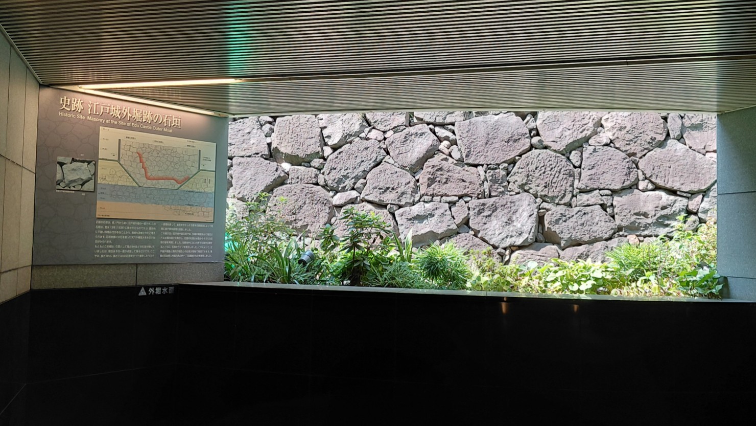 まずは、「虎ノ門」の名前の由来にもなった江戸城の外堀跡を見学。東京メトロ虎ノ門駅の改札を出たら、11番出口に向かう手前にある展示室へと向かうと、旧江戸城の石垣を観察できます。