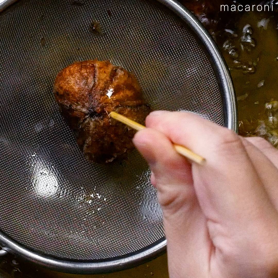 3: 160℃の油で10分程度揚げます。竹串がすっとささったら取り出します。