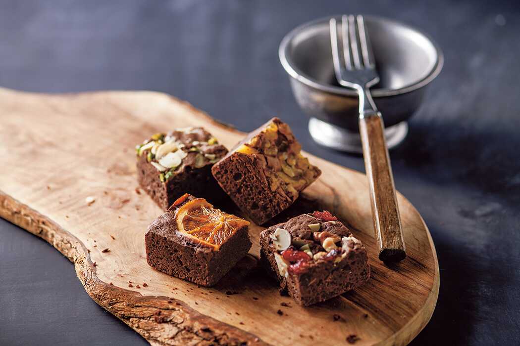 チョコレート生地とカラフルなフルーツやナッツのコントラストが美しく、見た目にも華やか。贈りものにもぴったりです。