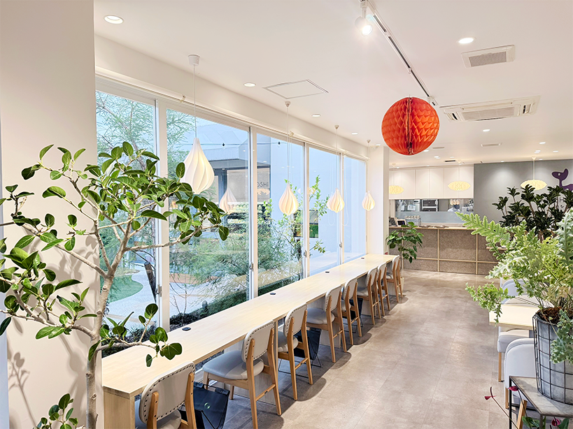 店内のイートインスペースには、ガラス張りの大きな窓からやわらかな陽が差し込み、緑にあふれた空間が心地よい開放感をもたらしてくれます。(※取材日がハロウィン時季であったため一部ハロウィン装飾になっています)