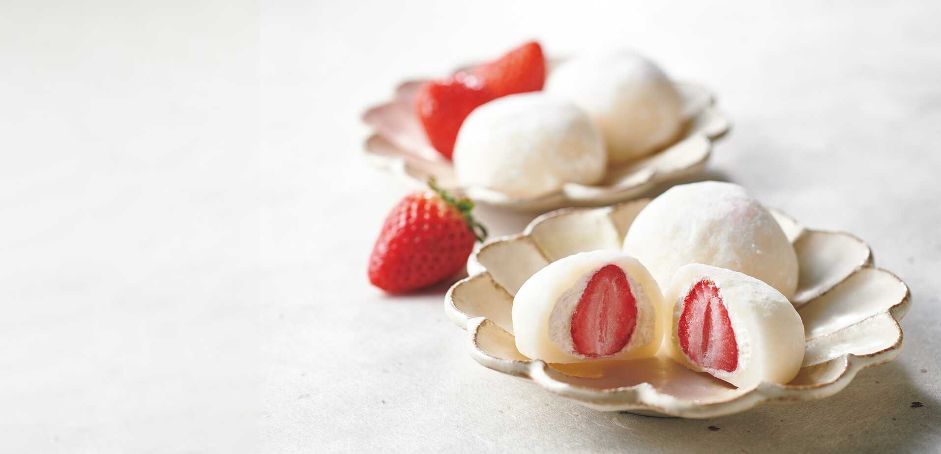 ふわりとやわらかな求肥で、あまおういちごと生クリームをやさしく包み込んだ洋風大福。