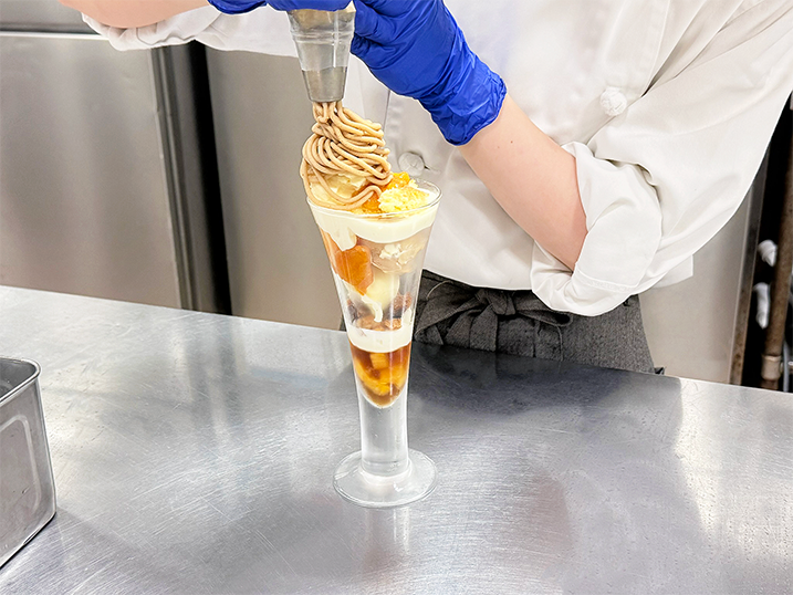 グラスの底から順に、アールグレイゼリー、きざみ栗、チーズクリーム、柿タタン、和栗のペースト、とろけるように熟した柿の果肉など、さまざまな素材が丁寧に重ねられています。美しく層をなすその姿と、仕上げの繊細な手仕事は、まさに職人の技。
