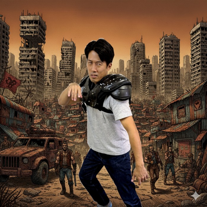さて、70パーセントケンシロウのスナシロウを、生成AIに作らせた世紀末っぽい背景と合わせると、かなりしっくり来てる! もしかして、スナシロウはケンシロウの生まれ変わりなんじゃないのか?