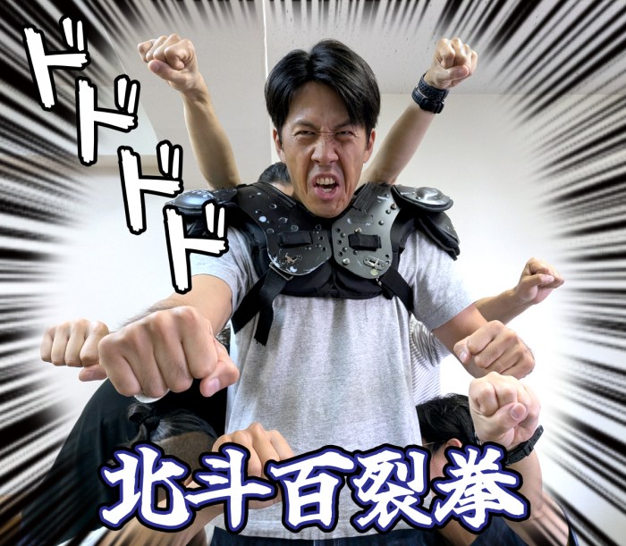 ということで、今日は北斗百裂拳の再現に挑んでみたいと思います。今回は「ロケットニュースのケンシロウ」こと、砂子間正貫にモデルになってもらうとしよう。彼の好きな言葉は「お前のようなババアがいるか!!」なのだそうです。