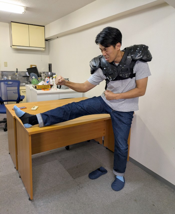 まずスナシロウにプロテクターを着けてもらおう。立っているだけで、50パーセントくらいケンシロウだったのだが、これを装着することで、70パーセントケンシロウになった。さすがスナシロウだな。