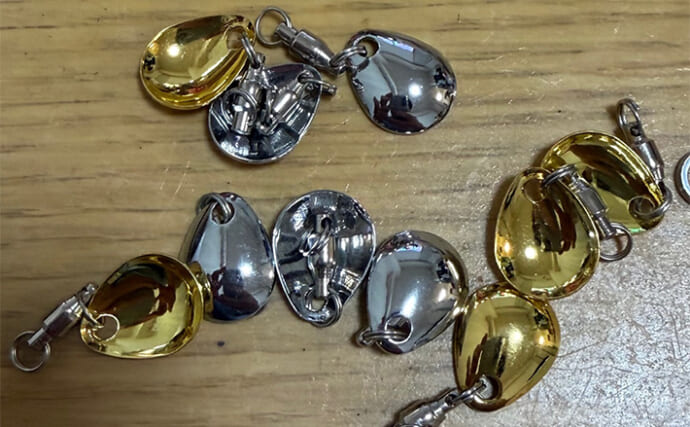 「ブレード」とは、金属製の扁平形状の部品で、ジグのリア部分に取り付けられ、引くと回転することでアピール力を発揮する。主に金色や銀色で、光を反射して魚の目を引き寄せる役割を担っている。