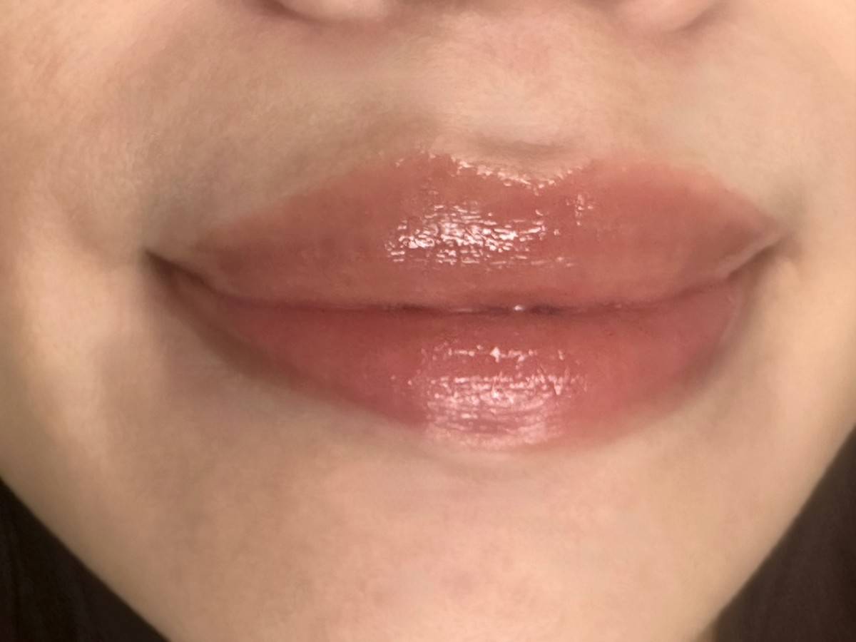 一度塗りだと唇が透けるような非常にシアーな発色ですが、重ねれば重ねるほどしっかりと濃くなります。