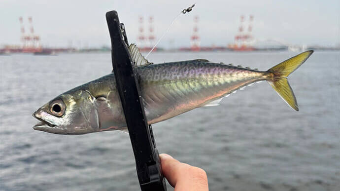 直ぐに落とし直すとキューと乗ってきた。少し強い引きだが、マダイの引きではない。ドラグを緩めジリジリとラインを出しながら仕留めたのは30cmほどのマルアジ。背中合わせのアングラーは、サバまで仕留めたので、マダイ、ハマチ、サワラとで六目釣り。これがビニールで釣れるのだから、不思議な釣りだ。