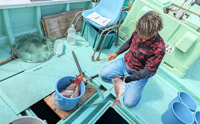 畑中丸では、魚の処理は船長任せ。針を外してエア抜きして生簀に放り込まれるまで、写真を撮る隙もない。このまま(仕掛けを)下してと言われたので、投下して着底。巻きだすとカツンカツン……。嘘やろ!?ほとんど巻くこともないままに2匹目がヒット。ドキドキタイムを経て同サイズをキャッチ。