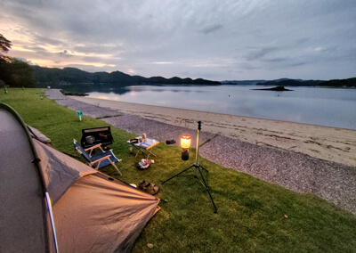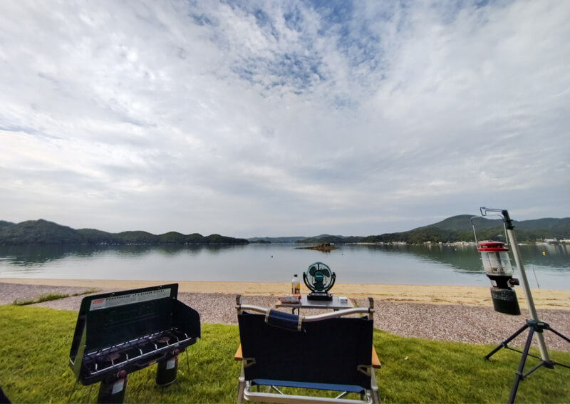 カヤックを終えてサイトに戻ると、海を眺めながらのんびり過ごす時間が待っています。サイトに腰を下ろし、遠くの島々を眺めながら読書や食事を楽しむと、静かで落ち着いた時間を味わえます。残暑の海風が心地よく、夕方の海は柔らかな光に包まれ、波の音が静かに響く穏やかな景色が広がっていました。