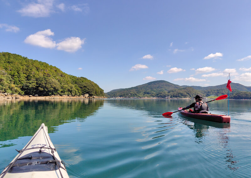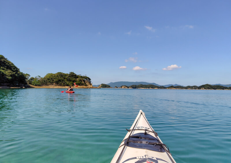 翌日は快晴となり、インストラクター付きの「海でのおさんぽ」コースで再びカヤックを漕ぎました。往復3kmほどのコースを約1時間かけながら、北九十九島の島々をゆっくり眺めつつカヤックを漕ぐ時間は、景色や波の音を存分に楽しむことができます。入り江や島影の間を進むと波で少し揺れることもありましたが、インストラクターのサポートがあるため、安心して自分のペースでのんびりと海上で過ごすことができました。