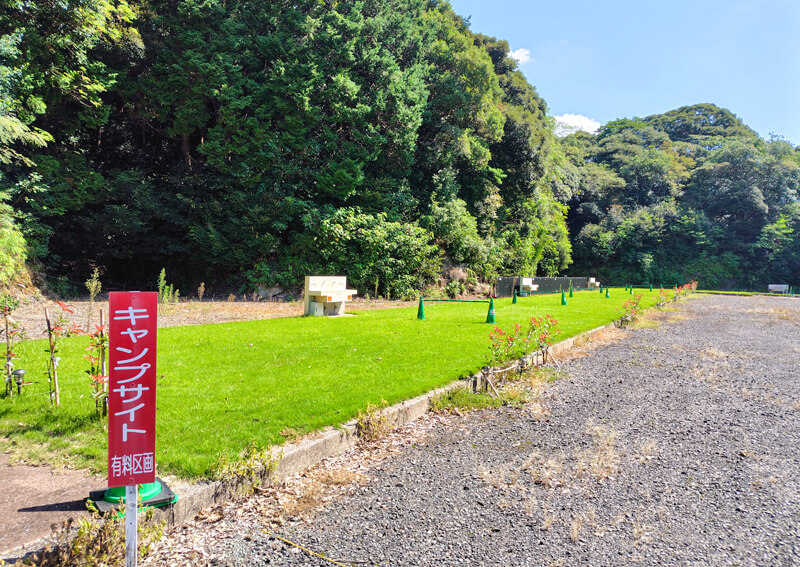 「オートエリア」のサイト数は8サイト(いずれも7m×10m)。管理棟、砂浜から約200m離れた場所にあるため、サイトから海岸に行くには徒歩で行く必要がありますが、車はサイトの前に停めることができます。トイレはオートエリアに1ヵ所。炊事場、電源(15アンペア)はそれぞれの区画に備えられており、快適にキャンプが可能です。芝生のサイトでペグも刺さりやすく、設営しやすいといった印象でした。