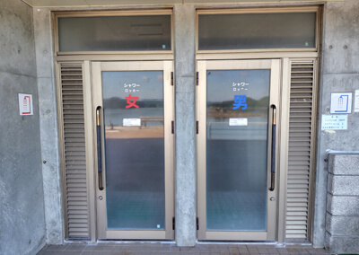一方、「ベイエリア」のサイト数は8サイト(8m×7m※)。こちらはオーシャンビューが楽しめる開放的なサイトです。ベイエリア横の管理棟には、トイレ(多目的トイレ1ヵ所)とシャワー室があり、足洗場も設置されています。こちらも芝生でペグが刺さりやすく、オートエリアと同様に個別に炊事場、電源が設置されています。