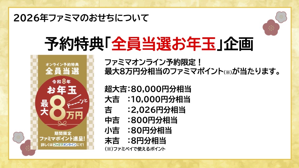 また、ファミマオンライン予約限定の特典として「全員当選お年玉」企画を実施。抽選で最大8万円分相当(令和8年にちなんだ「超大吉」)のファミマポイントが進呈されるなど、予約購買を後押しするキャンペーンも展開している。