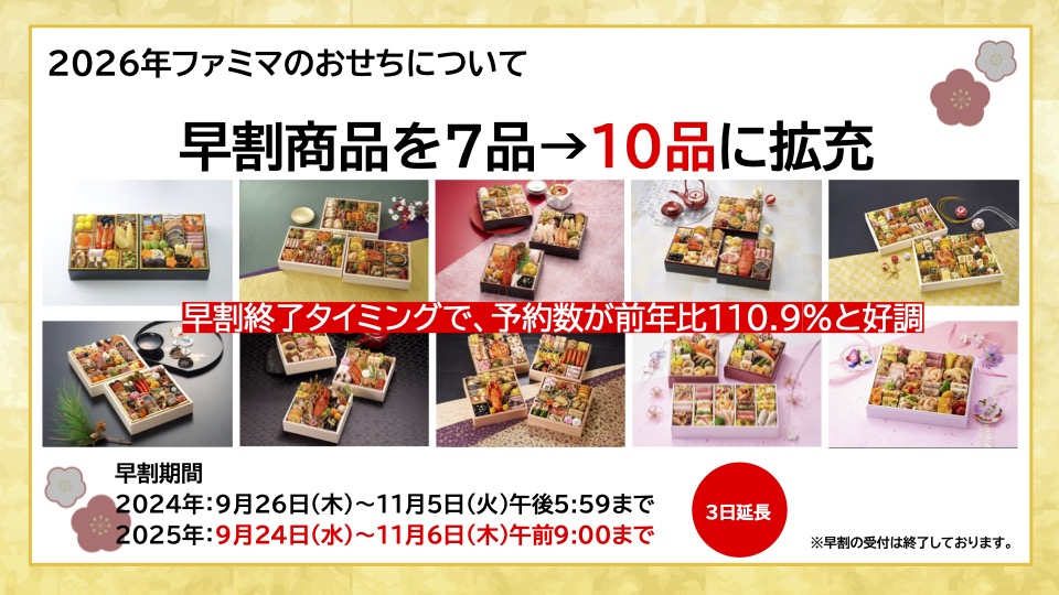 これに応えるべく、ファミリーマートは「贅沢」と「コスパ」の両軸で商品ラインナップを強化し、早割や特典といった「お得感」を打ち出すことで支持を集めている。おせちという伝統文化もまた、時代の変化や消費者のニーズに合わせて柔軟に進化し続けているといえるだろう。