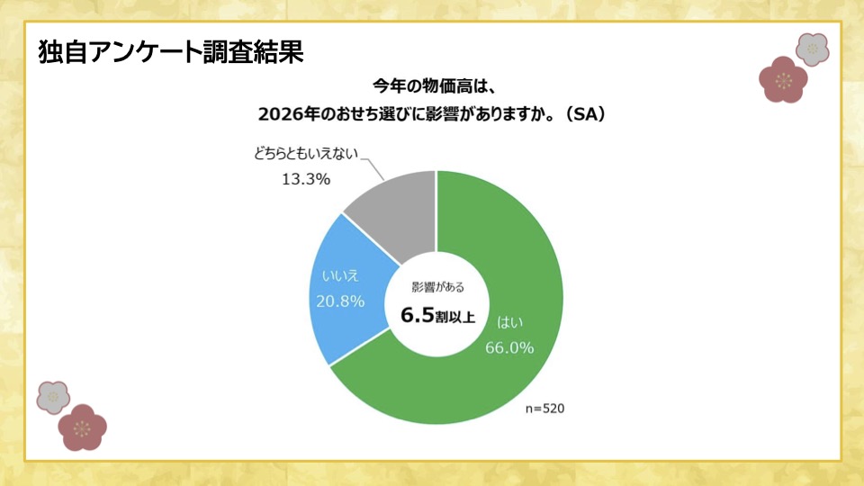 ファミリーマートが実施した「2026年のおせちに関するアンケート」(対象:20〜60代の既婚男女520名)によると、昨今の物価高がおせち選びに「影響がある」と回答した人は66.0%に上った。
