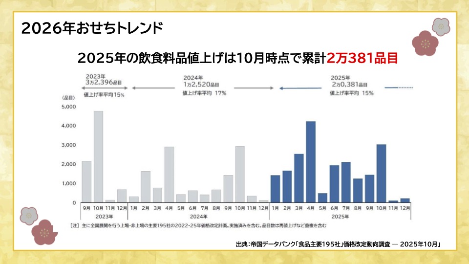 はじめに掛谷氏は、食品市場を取り巻く厳しい現状について触れた。2025年の飲食料品の値上げ品目数は、10月時点で累計2万381品目に到達。これは昨年の年間合計(1万2520品目)を大きく上回り、2023年以来2年ぶりに2万品目を超える高水準となった。特に飲食料品を中心とした値上げの勢いは強く、家計への負担は増す一方だ。