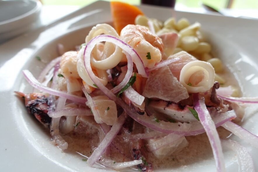 ペルーを代表する魚料理が「セビーチェ」。インカ帝国時代から作られてきたと言われています。白身魚やタコ、エビなどとタマネギやトマト、香草を柑橘果汁で合えたさわやかなマリネ料理です。