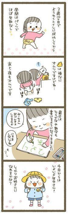 ウンチが出ると言うと私に「じゃあトイレ行く?」と訊かれるから、わざと誰かがトイレに入っているときに「うんちでる」と言い、「といれ、にぃに入ってるから」と、本当はトイレに行きたいけど埋まってるから仕方なくオムツをはきますよ感を出すんですよ(笑)