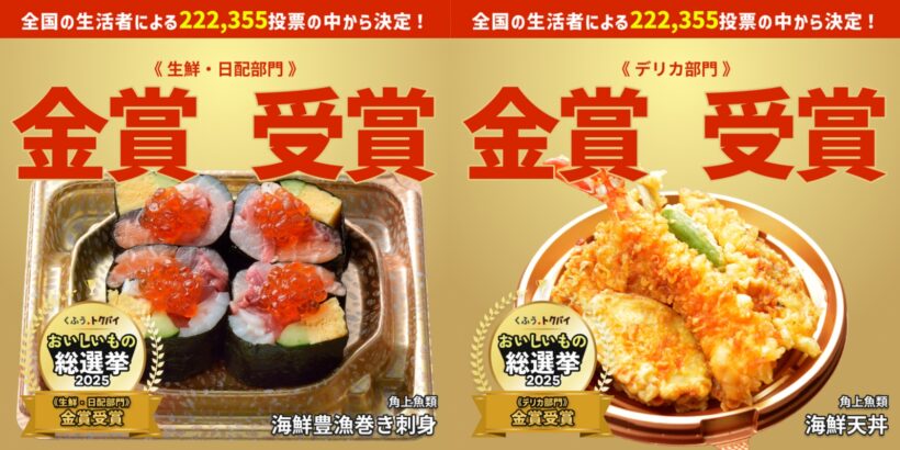 さらに、生鮮・日配部門の「海鮮豊漁巻き刺身」、デリカ部門の「海鮮天丼」も金賞に輝き、エントリーした3商品全てで受賞するという快挙を成し遂げた。