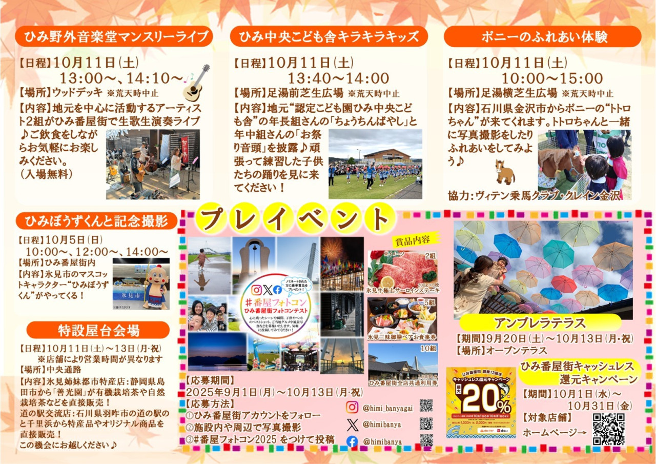 北陸の道の駅の中でトップランクの人気を誇る「ひみ番屋街」の13周年を記念した感謝祭。期間中は、各店舗厳選のワンコイングルメやお土産が販売されるほか、働くクルマの展示やポニーとのふれあい体験、園児の歌や踊り、生演奏ライブなどを楽しめます。