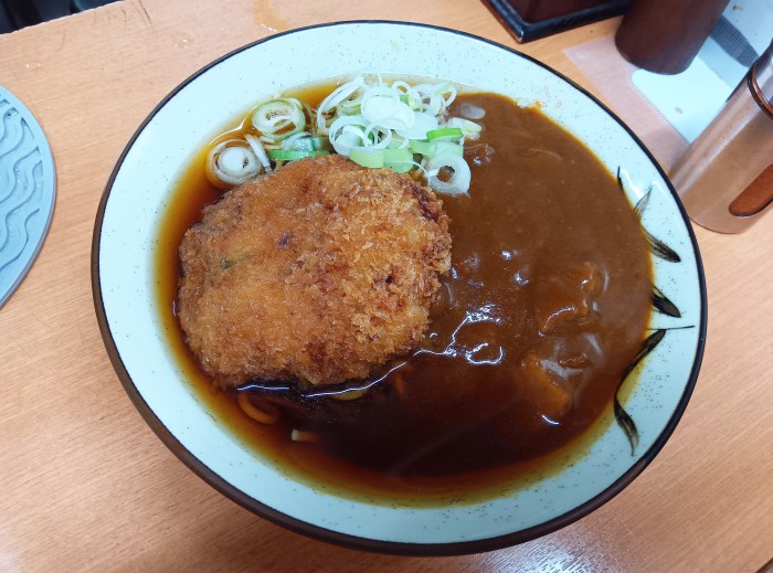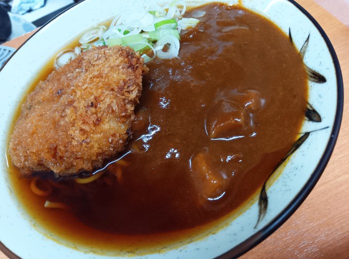 そこでメンチカツトッピングで注文してみたところ、カレーはレトルトだけど、前述の通りつゆがコク深いため、そのコクがカレーを大分底上げしている。そのため、カレーつゆとしてはレトルト的安っぽさは感じられなかった。