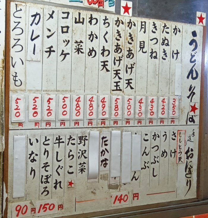 しかし、何度も通ってるうちにあることに気づいた。この店の店外メニューは「かけ(350円)」「たぬき(420円)」「きつね(430円)」「月見(430円)」「かきあげ天(500円)」「かきあげ天玉(580円)」「ちくわ天(490円)」「わかめ(480円)」「山菜(480円)」「コロッケ(500円)」「メンチ(520円)」と並んでいる。だが店内に貼られたメニュー表をよく見てみると……