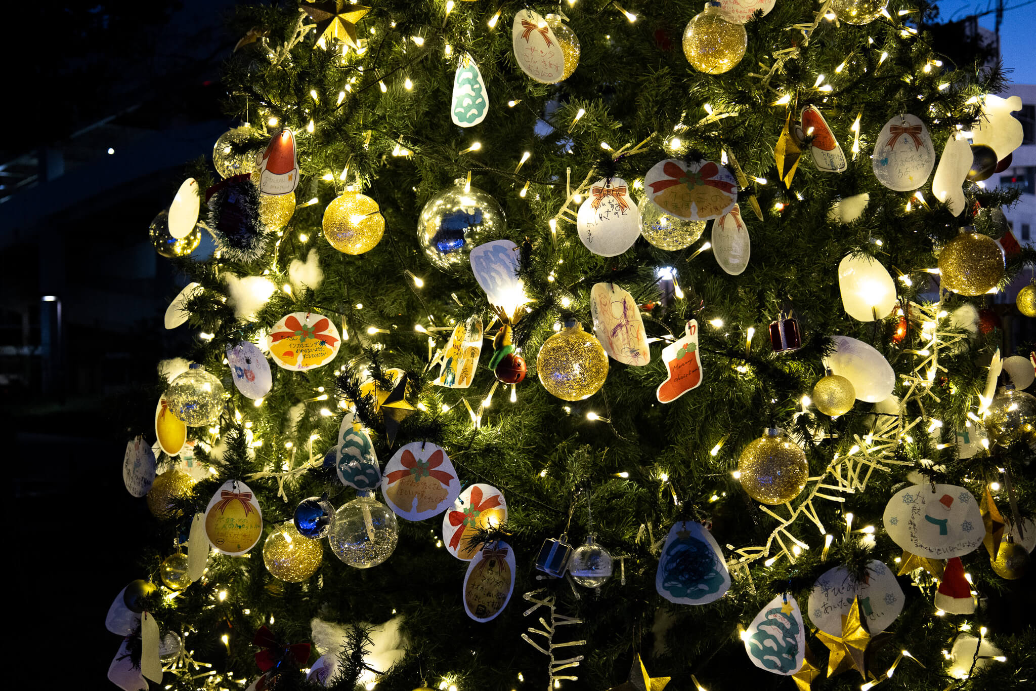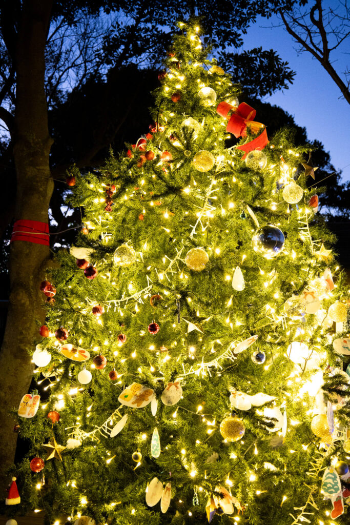 ②事務所横ツリー 思い思いに描いたメッセージカードやオーナメントが飾られた大きなクリスマスツリー。ゴールドのライトと手作りの飾りの組み合わせが、都会の華やかさとはまた違う“海辺の公園らしい素朴な可愛さ”を演出しています。