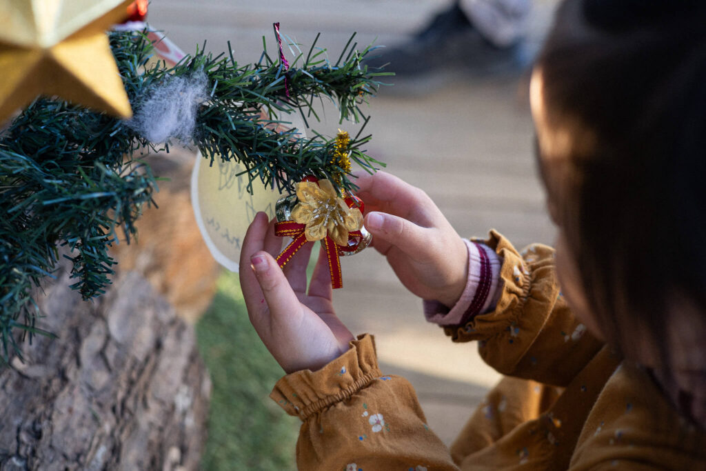 大事そうにオーナメントをくくりつける小さな手が、とても可愛らしく、見ているこちらまであたたかい気持ちになります。