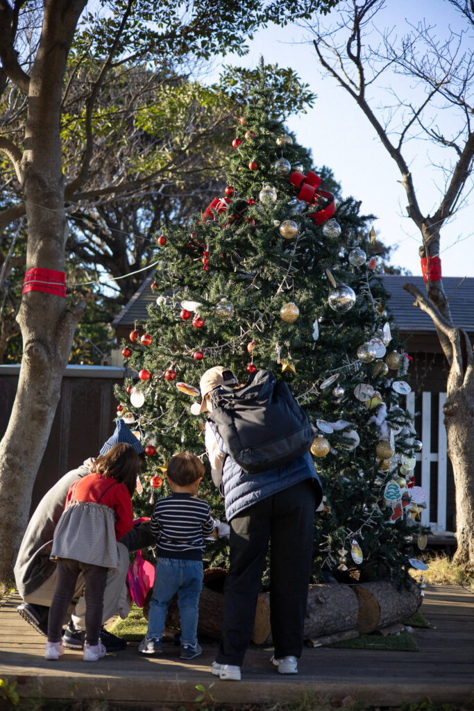 公園内にある管理事務所横のスペースには、カラフルなオーナメントとメッセージカードが用意されていました。子どもたちは願い事や家族へのメッセージを書き込んで、クリスマスツリーに思い思いの飾りつけを楽しめます。