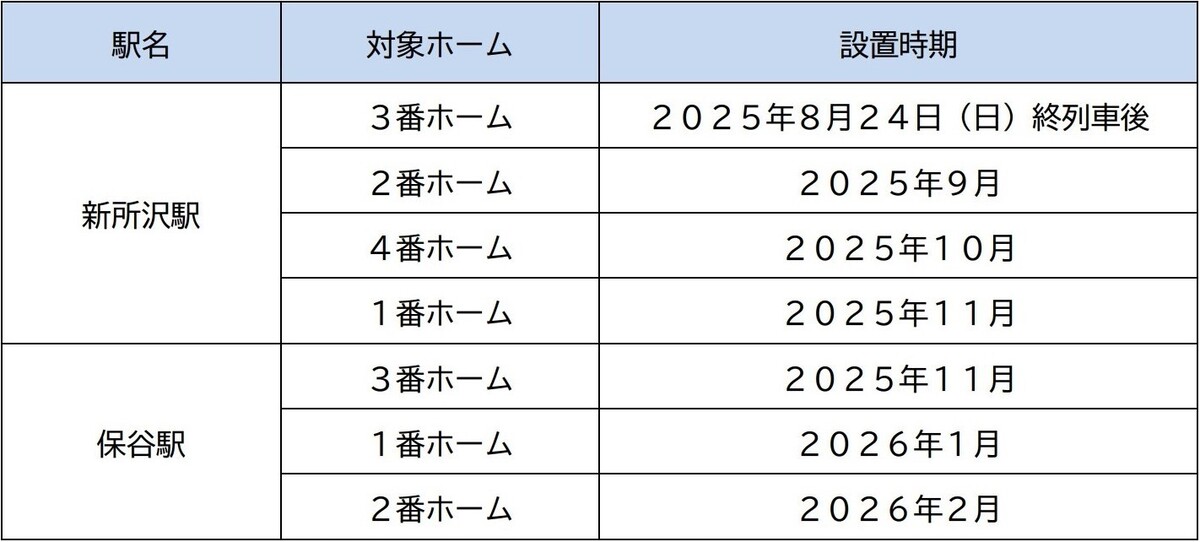 西武鉄道は新所沢駅と保谷駅にホームドアを順次整備する方針です。新所沢駅の3番ホームは2025年8月24日(日)の終列車後に設置され、9月中の稼働開始が予定されています。