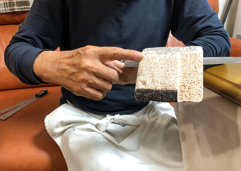 ちなみに砥石は、大きく「荒砥石」「中砥石」「仕上げ砥石」の3種類に分かれるのですが、粒子の細かさによってさらに細分化されます。JIS規格で粒度が表示されていて、概ね#180~200が荒砥石、#800~1500が中砥石、#2000~10000が仕上げ砥石、と呼ばれるそうです。