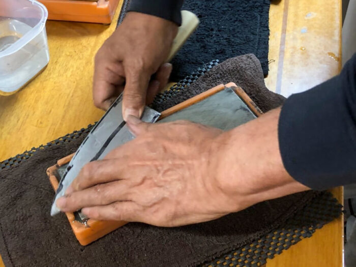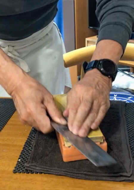 これを20回ほど繰り返します。そして、切っ先から刃元にかけて少しずつ場所をずらしながら、3~4回に分けて順番に刃全体を研いでいきます。