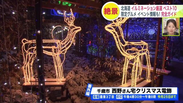 千歳市豊里3丁目の西野さん宅のイルミネーションは、午後4時30分~午後8時まで点灯。12月25日まで楽しめます。