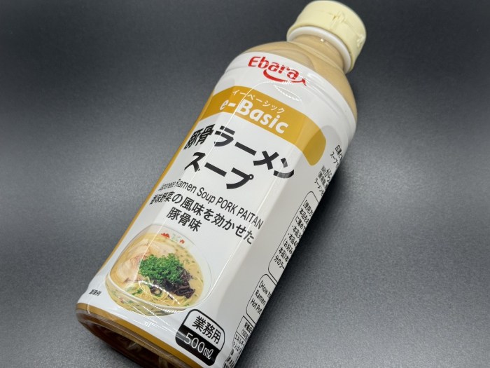 「e-Basic 豚骨ラーメンスープ」は、なんと同社の業務用サイト取扱商品! 飲食店などで使われているもので、ちょっと珍しいんじゃないだろうか。公式オンラインショップでは1.8Lのビッグサイズもあるけれど、今回入っていたのは500mlのもの。普段は1本540円で販売されている模様。