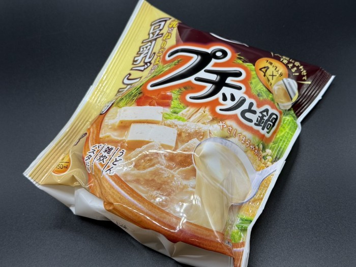 お馴染み「プチッと」シリーズから「プチッと鍋 豆乳ごま鍋」。これは定番中の定番と言えるだろう。同じく実売価格は税込300円くらい。