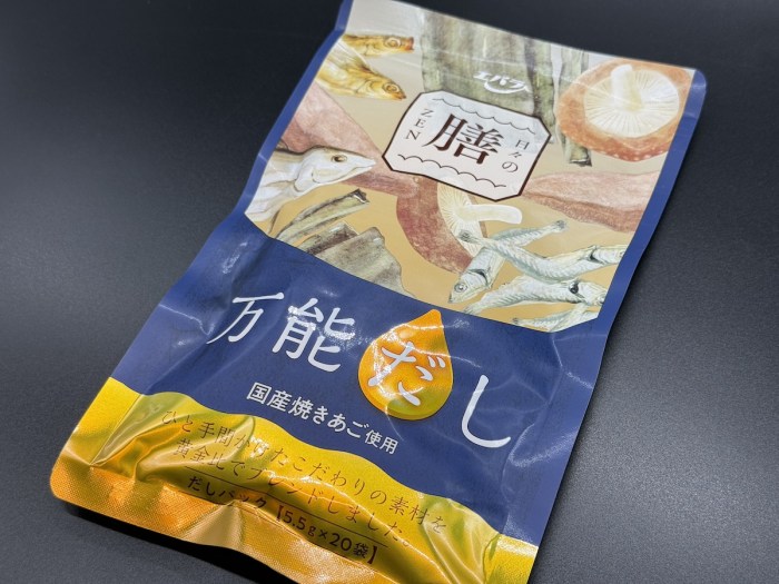 「素材だし」と「万能だし」の2種類あるのだが、今回同梱の「万能だし」は調味済みで、料理初心者にも使いやすいそう。公式オンラインショップでは20包入り税込1998円の商品。