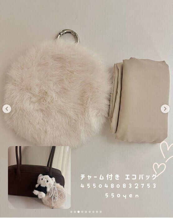 ____mii.17さんが購入したのは、ダイソー×TGCのチャーム付きエコバッグ。ファー素材の円形ポーチと、無地のシンプルなエコバッグがセットになっているようです。550円商品のようですが、小さいバッグのときにも便利でとてもいい商品と大絶賛の様子◎