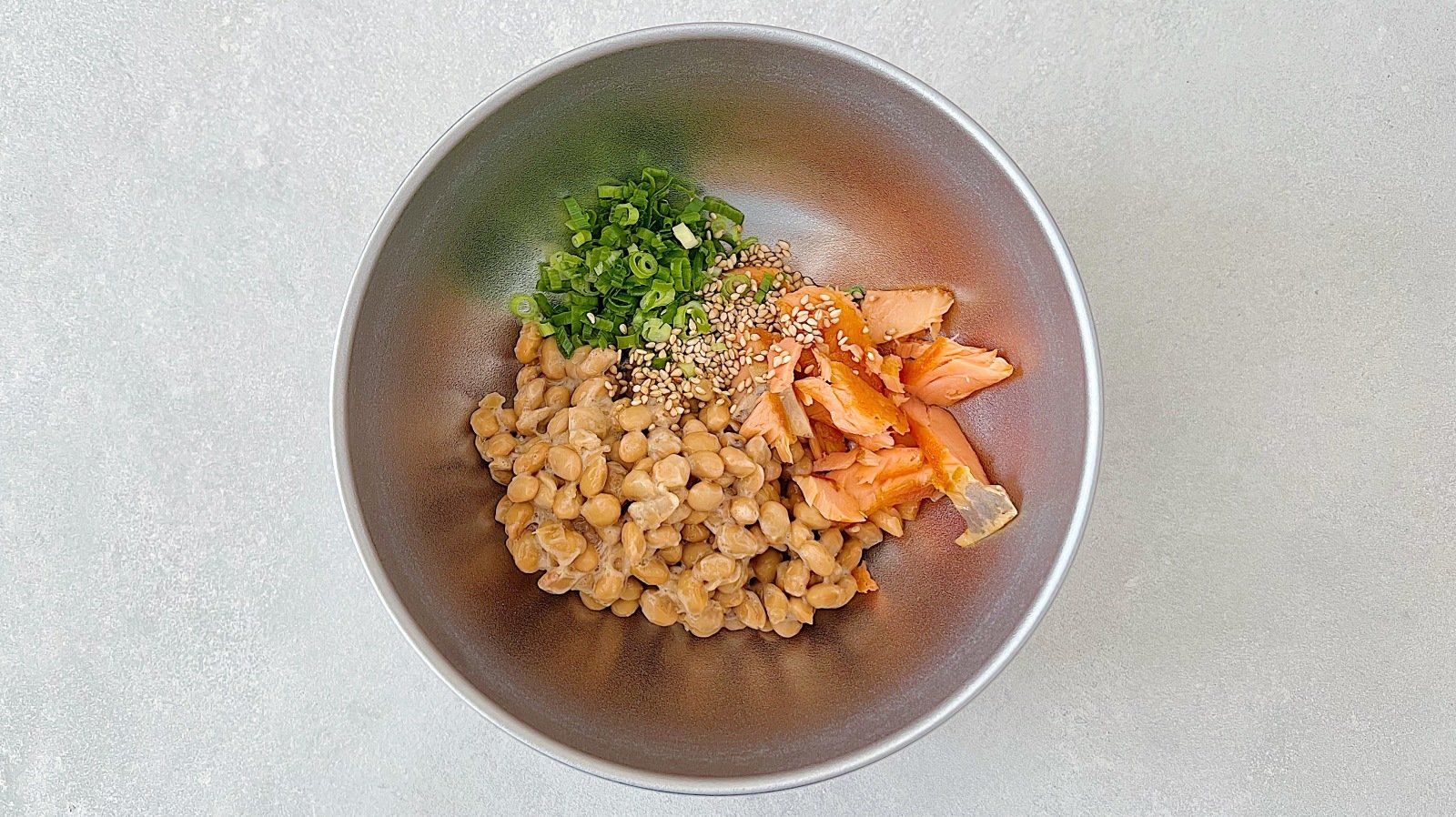 アスタキサンチンの抗酸化力、納豆の発酵パワー、鮭の良質な脂質が一度にとれるレシピをぜひお試しください。