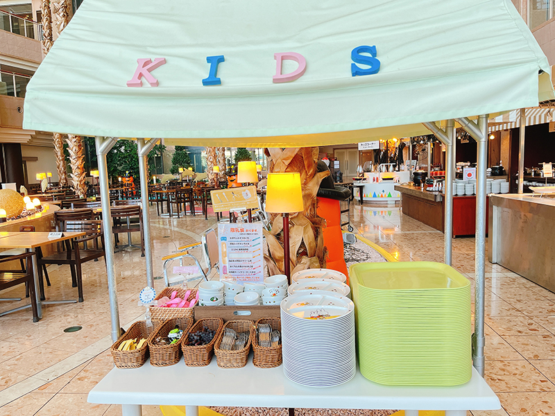 「家族にやさしいリゾート」を掲げるだけあって、キッズサービスが充実しているのは、ほかにはない特徴のひとつです。キッズコーナーにはキッズ用のかわいいプレートやカトラリーが揃い、もちろんお子様用椅子も用意。ベビーカーでの入場もOKです。特筆すべきはベビーベッドの貸し出しと月齢に応じた離乳食が用意され、いずれも無料で対応していること。レストラン内には授乳スペースも完備しているので、乳幼児連れでも安心してビュッフェを楽しめます。