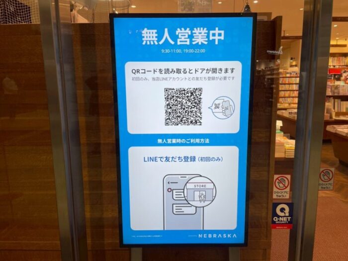 「無人営業中」の表示パネルがあり、QRコードを読み取り、長崎書店の公式LINEを追加すると、ドアが開く仕組みになっています。