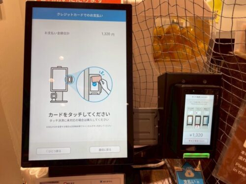 レジの横に、大きなパネルのセルフレジがあるので、早速本を持っていって、こちらでお会計を行います。 まずは本のバーコードを読み込んで、その後、支払いを行います。 無人レジでは、現金や図書カードなどは使えず、クレジットカードや、Paypay・d払いなどのQRコード決済、楽天エディやnanacoなどの電子マネーが利用可能となっています。 今回は、クレジットカードで支払いを行いました。