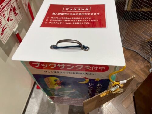こちらは無人営業中も寄付が可能で、購入した本を、こちらのボックスに入れれば、子どもたちに本を届けることができますよ! 9月23日からクリスマスの12月25日までの、期間限定のプロジェクトになりますので、サンタさんになって、子どもたちに本を届けたい方はぜひ、本の寄付もされてみてくださいね!