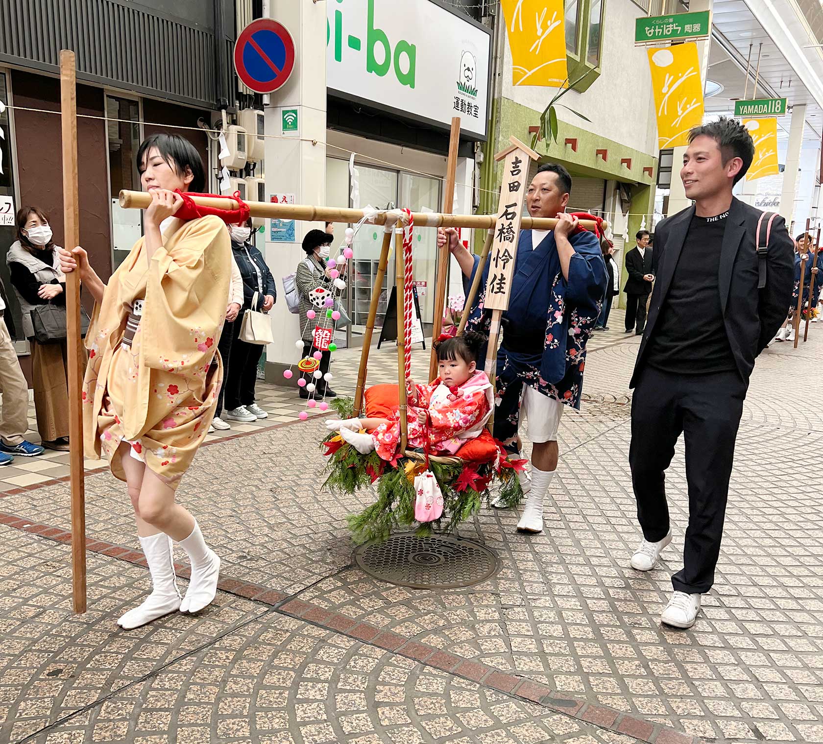 子どもの健やかな成長を、11月などに感謝する「七五三」の中でも、男女ともに祝われる3歳児を皆でお祝いしようと、山口天神祭では3歳児を乗せる「宝恵籠(ほえかご)」が行列に加えられている。