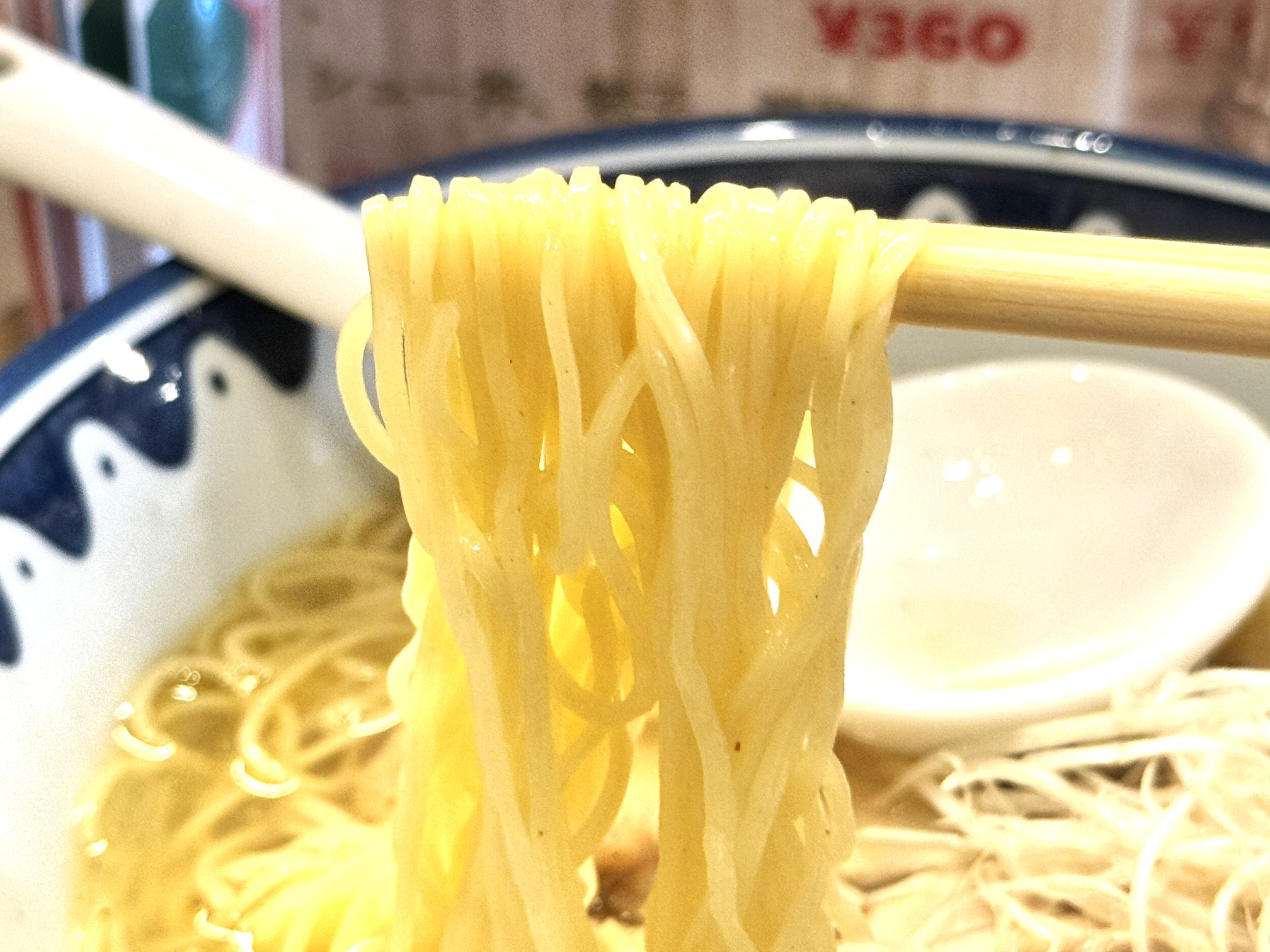 細めの麺はのど越しが良く、するすると啜ることができます。スープがよく絡むので、麺を啜りながら鶏のうまみをしっかりと感じることができます。