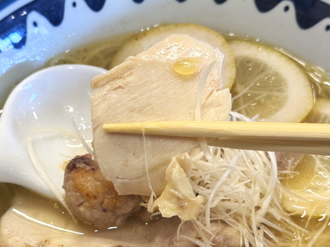 鶏チャーシューは箸で持ち上げるとほろほろとくずれてしまうほどにやわらかく、ほどよく塩味の染み込んだお肉の満足感も嬉しいポイント。