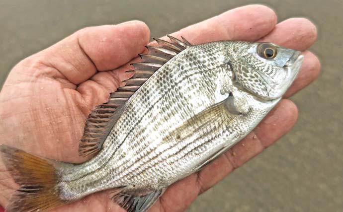 思わぬ大型に喜びを感じながら、次を狙って続ける。濁りのせいか良型ハゼに交じってクロダイの幼魚が釣れて強い引きを楽しめる。