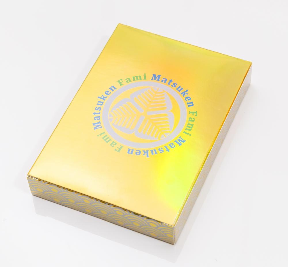 ゴールドを基調にした華やかなデザイン。マツケンの笑顔が毎日の食卓を明るく演出します。