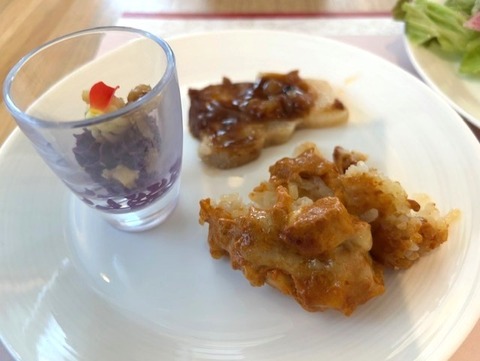 左手の器「紫芋とサツマイモのムース」はしっとりクリーミーなサツマイモで箸休めにぴったり、おかわりしていただきました。「ポークとナッツと栗のキャラメリゼ」も美味しかったし、手前の「シーフードドリア」も美味しくいただきました。