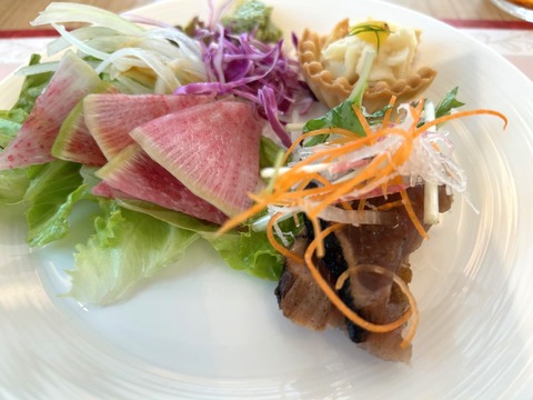 お野菜がたっぷり取れるのも嬉しいです。白身魚と焼き栗のタルトレットはタルトがポロポロと割れてしまったのですが、やさしい味でこれも美味しかったです。鰹のカルパッチョもお野菜と一緒に美味しくいただきました。